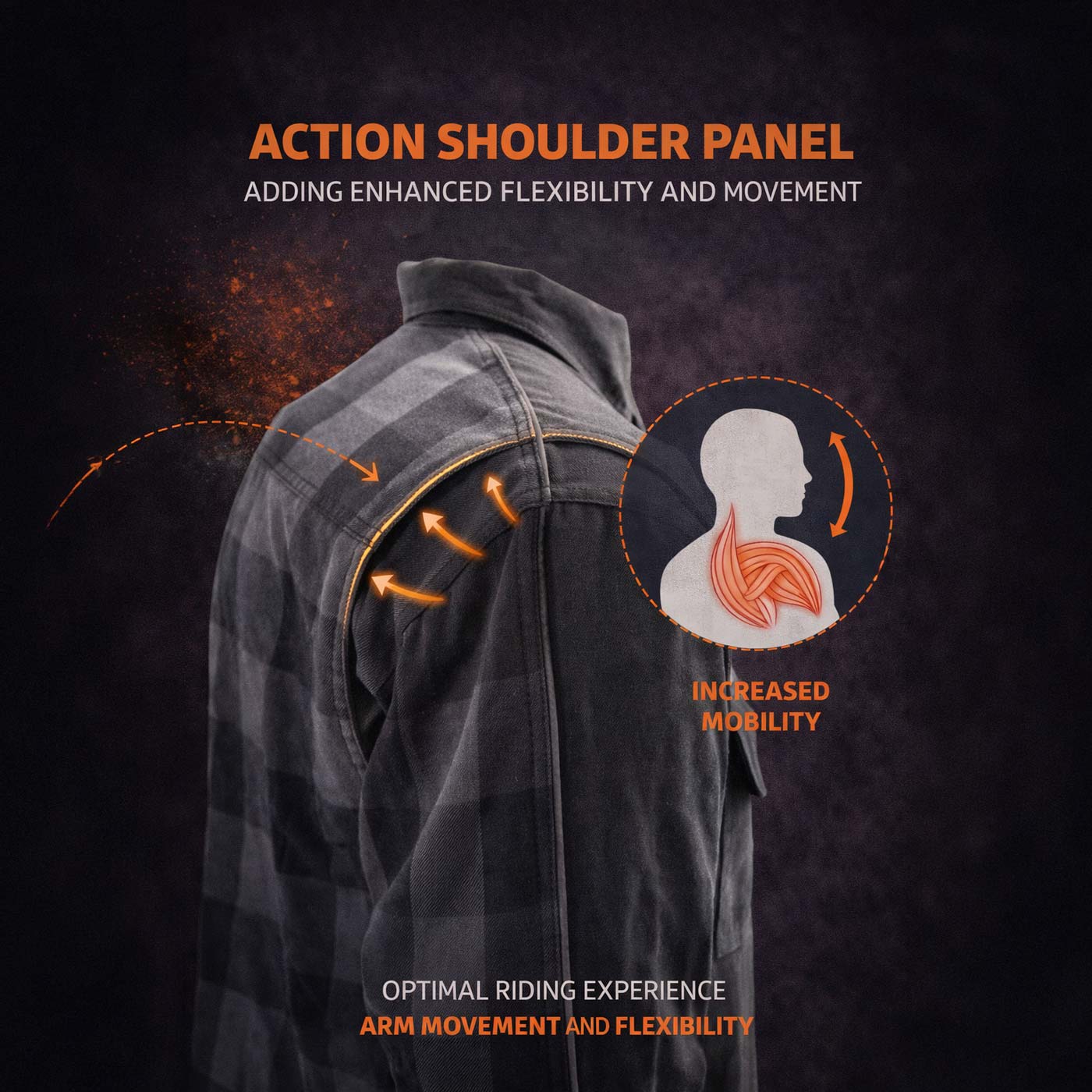 This two-tone version keeps the armored flannel formula—Kevlar® reinforcement, CE armor, vents, mesh liner—and adds reflective arm piping for a subtle low-light edge. From the cockpit you get a clean black front; from behind it reads like a classic buffalo-check flannel.