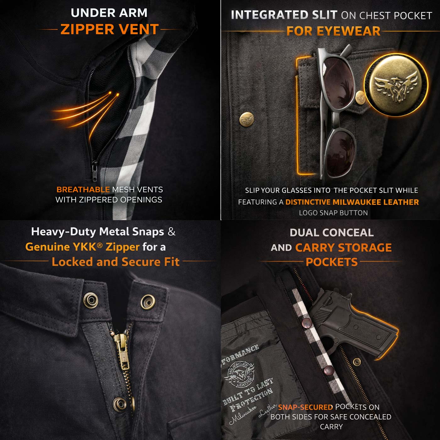 Milwaukee Leather MPM1673 Men’s Two-Tone Armored Flannel – Solid Front, Plaid Back, CE Armor, Kevlar® Reinforced