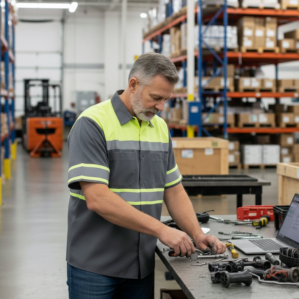 Mechanic‑grade 50/50 cotton‑poly blend (durable, breathable)