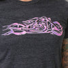 This ladies full length t-shirt in the color Heather Charcoal features a screen printed design of a pink and purple flaming bobber style motorcycle on the front.